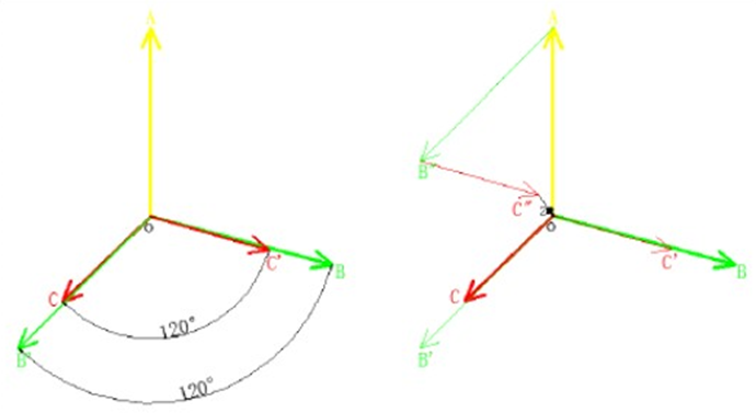 2)負(fù)序: A 相落后 B 相 120 度,B 相落后 C 相 120 度,C 相落后 A 相 120度。